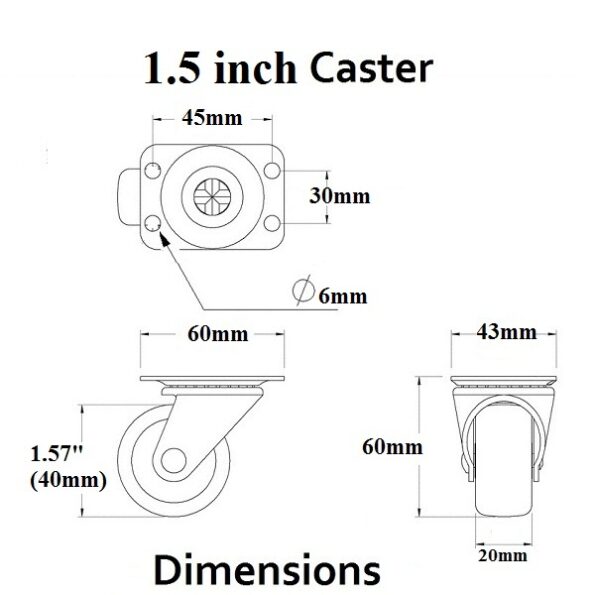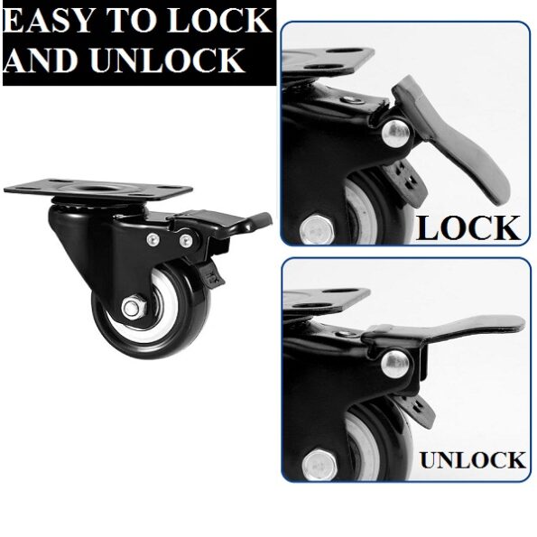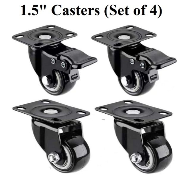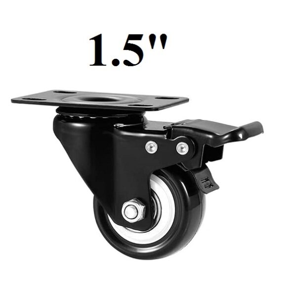 1.5inch Black Swivel Casters with Polyurethane Wheel and Lock (Set of 4Pieces): This Black Caster has a wheel with a hard polypropylene core for strength with a polyurethane tread that combines the abrasion resistance of plastic with the shock-absorbing qualities of rubber. Use them on smooth or rough floors and in areas with debris.