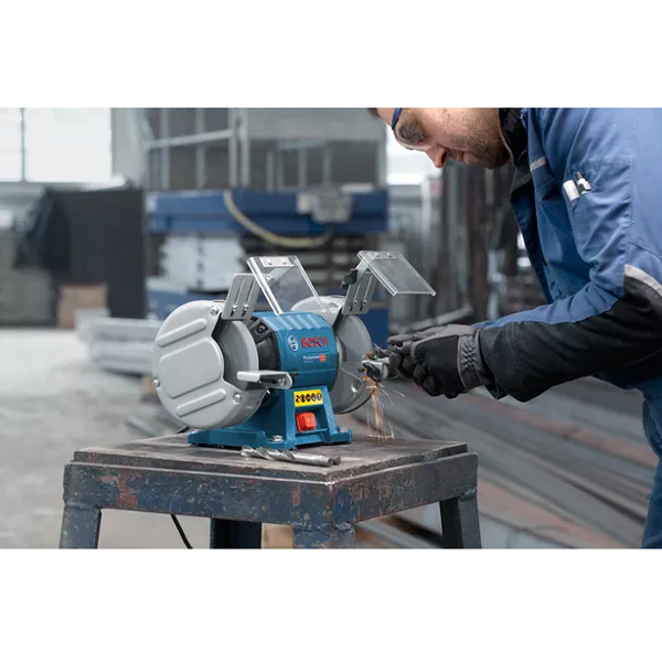 150mm Double-Wheeled Bench Grinder – 350W – Bosch GBG 35-15: With its powerful, 350 W maintenance-free induction motor, this bench grinder can tackle the toughest grinding, deburring, and sharpening jobs in a wide variety of industrial working conditions. The robust, die-cast aluminium housing with encapsulated ball bearings keeps the motor dust free for long-lasting performance. The solid base holds this compact grinder stable and, therefore, ensures a smooth operation.