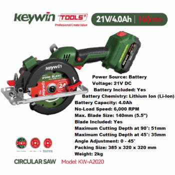 5.5inch Cordless Circular Saw – 21V, 4.0Ah,140mm – Keywin KW-A2020