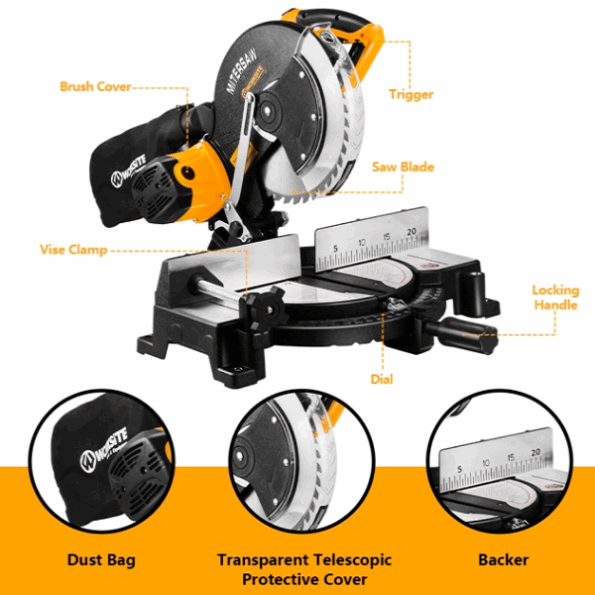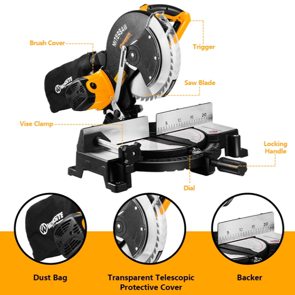 Package list: | 1 x 255MM Sliding Miter Saw WORKSITE CMS236 1 x Blade 1 x Wrench 1 x Carbon Brush 1 x Vise Clamp 1 x Locking Handle 1 x Dust Bag 1 x Manual |