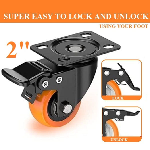 2inch Orange Swivel Caster with Polyurethane Wheel and Locking Brake: This Orange Caster has a wheel with a hard polypropylene core for strength with a polyurethane tread that combines the abrasion resistance of plastic with the shock-absorbing qualities of rubber. Use them on smooth or rough floors and in areas with debris.