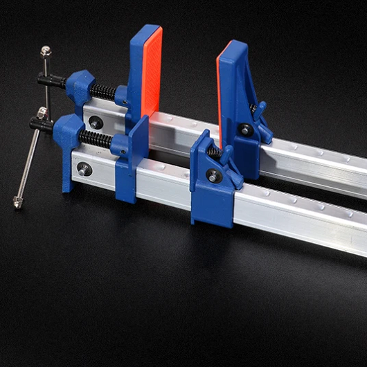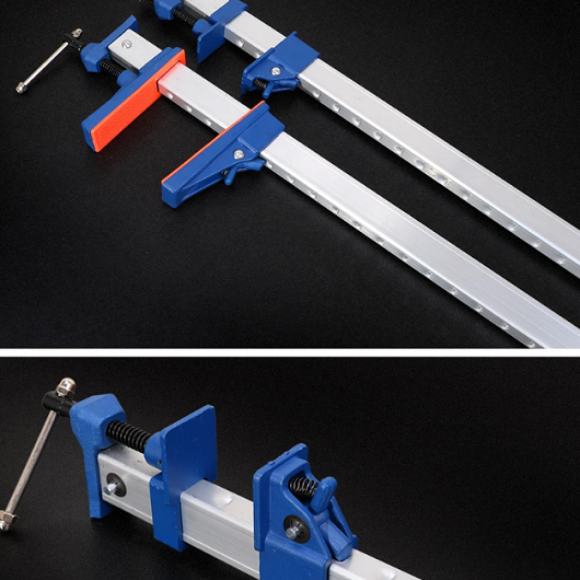 36inch Aluminium Sash Clamp is a large type of bar clamp commonly used in workshops. Unlike many other clamps with steel beams, and steel or cast iron heads, this specific clamp is made of high-strength anodized aluminum. Anodized aluminum is aluminum that has undergone an anodizing process to create an exceptionally durable, corrosion-resistant, and aesthetically appealing surface. The use of strong but lightweight aluminium makes it much easier to lift and carry around. It is fitted with a predrilled row of holes along the bar which enables the moveable jaw to be inserted at the appropriate position before using the handle to tighten it down onto the material to create the desired amount of pressure. This clamp consists of a long sturdy beam, a clamping head, and a movable head. This movable head can be moved along the bar and fixed solidly in place with a lever. The sturdiness of the clamp can be enriched by inserting hard wood piece inside the aluminium profile