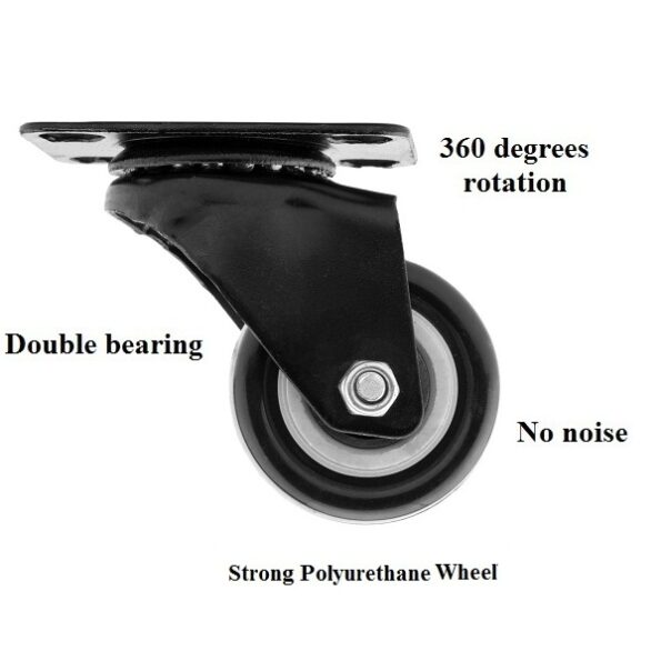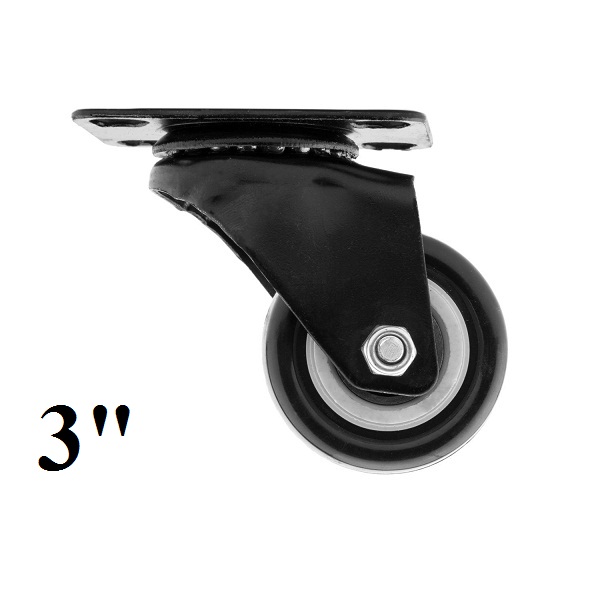 3inch Black Swivel Caster with Polyurethane Wheel and without Lock: This Caster has a wheel with a hard polypropylene core for strength with a polyurethane tread that combines the abrasion resistance of plastic with the shock-absorbing qualities of rubber. Use them on smooth or rough floors and in areas with debris.