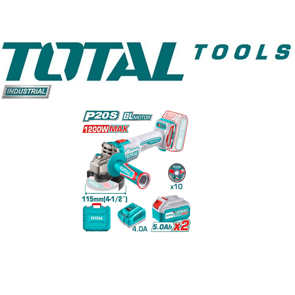 | Related Names: | 4½ inch Cordless Angle Grinder with 10 Pcs Abrasive Metal Cutting Disc, 2 Pcs 5Ah Battery Pack and Charger – 20V, 115mm – Total TAGLI2211532 |