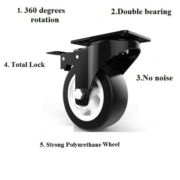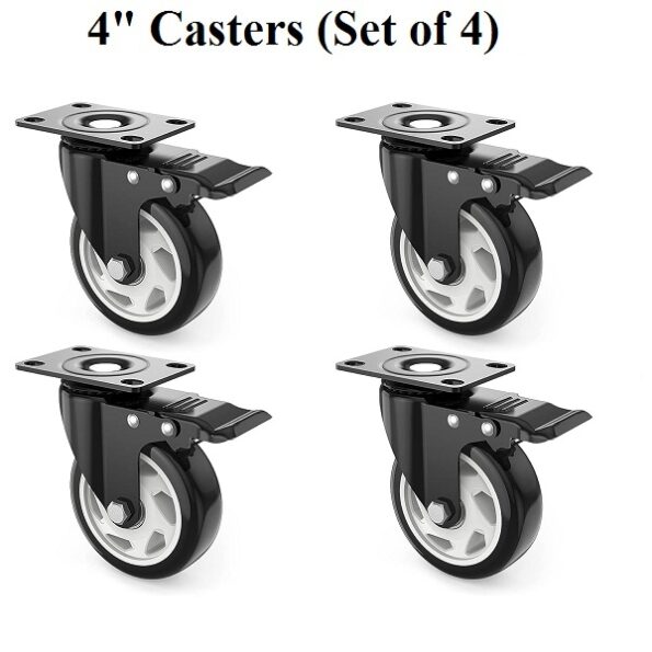 4inch Black Swivel Caster with Polyurethane Wheel and Locking Brake (Set of 4Pieces): This Caster has a wheel with a hard polypropylene core for strength with a polyurethane tread that combines the abrasion resistance of plastic with the shock-absorbing qualities of rubber. Use them on smooth or rough floors and in areas with debris.