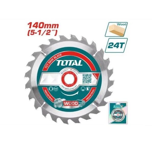 5½ inch 24T TCT Saw Blade (140mm, Tungsten Carbide Tipped) – TOTAL TAC232241. This blade is designed for longitudinal and cross cutting of wood. The teeth are reinforced with carbide inserts for increased productivity and blade life. They are sharpened on three sides with an alternating cutting edge bevel. These teeth significantly guarantee a clean cut.