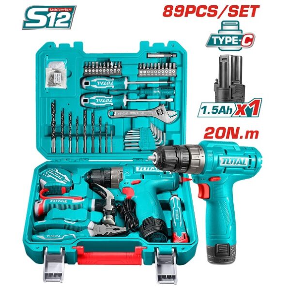 89 Pcs Tools Set with 12V 10mm cordless drill – Total THKTHP10892