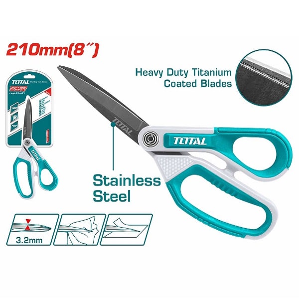 8inch (210mm) Rubber Grip Long Blade Scissors – TOTAL THSCRS812108: These scissors are made of stainless steel for protection against corrosion hence increasing their service life. The tool features a serrated bottom blade suitable when working on soft and flexible substances.